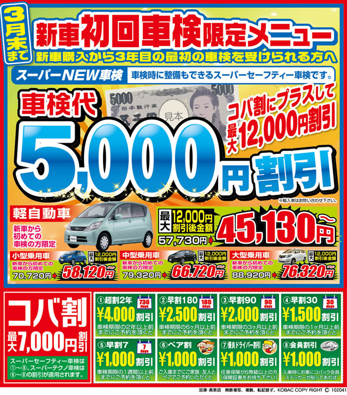 新車初回車検限定! スーパーNEW車検が5,000円割引コバ割にプラスして最大12,000円割引期間限定:2014年1月末迄