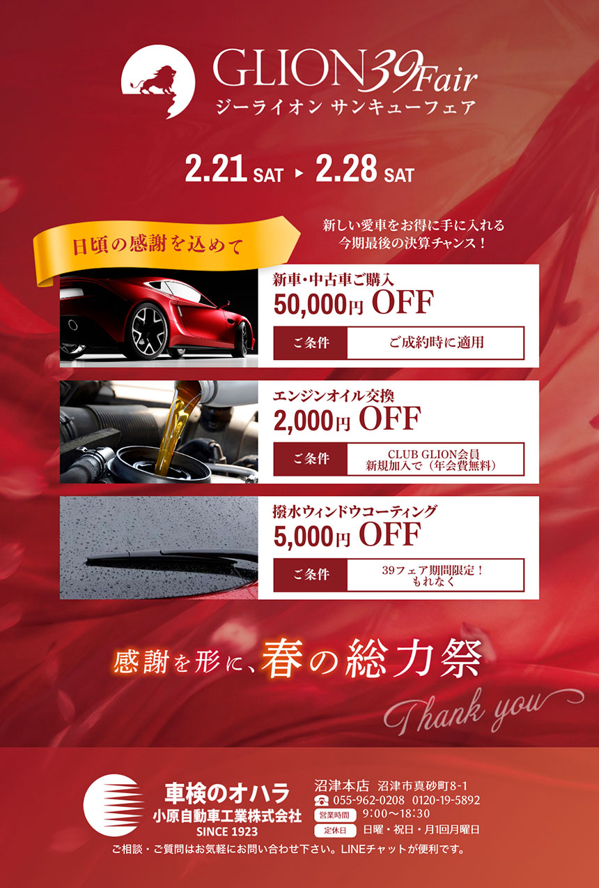 🎁 特典2:CLUB GLION新規ご加入で【エンジンオイル交換 2,000円割引】!(年会費無料)これからのカーライフがもっとお得に!